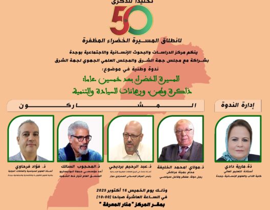 وينظم المركز أيضا، يوم الخميس 16 أكتوبر بالمكان ذاته، ندوة في موضوع: “المسيرة الخضراء بعد 50 عاما: ذاكرة وطن، ورهانات السيادة والتنمية”، وذلك بشراكة مع مجلس جهة الشرق والمجلس العلمي الجهوي لجهة الشرق.