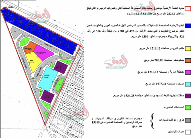 من جانبه أوضح القيسوني أن شركة باسطيف قامت بتوقيع “تصريح بتفويت وبصفة مجانية” لفائدة الجماعة، مع جميع الضمانات القانونية والواقعية، مجموعة من المرافق العمومية، وتضم ملحقة إدارية (251 متر مربع)، ومسجدا (563 متر مربع)، وطرقا وموقف للسيارات ومساحات خضراء، وقاعة متعددة الاستعمالات.