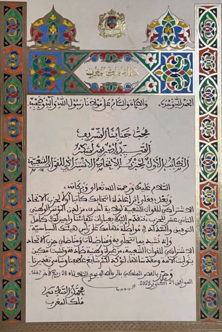 وأضاف الملك: “وإذ نشيد بما تتحلى به ومناضلات ومناضلي حزب الاتحاد الاشتراكي للقوات الشعبية، من غير وطنية صادقة وتشبث مكين بثوابت الأمة ومقدساتها، لنؤكد لكم سابغ عطفنا وسامي تقديرنا”.