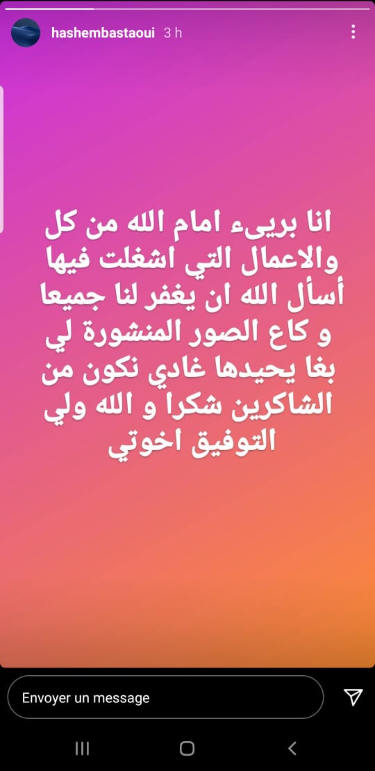 وقال البسطاوي: “أنا بريء أمام الله من كل الأعمال التي اشتغلت فيها، وأسأل الله أن يغفر لنا جميعا”، مضيفا “كاع الصور المنشورة لي بغا يحيدها غادي نكون من الشاكرين، شكرا والله ولي التوفيق اخوتي”.